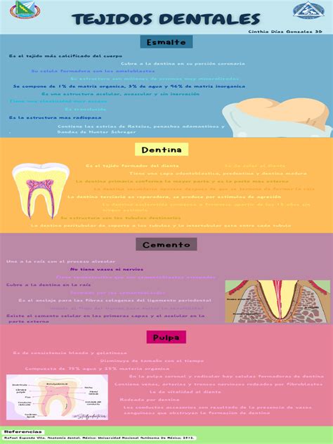 - Esmalte Dental: Es el tejido más duro del cuerpo humano, de color traslúcido y compuesto principalmente por minerales. No tiene terminaciones nerviosas, por lo que es insensible al dolor y protege al diente de las agresiones externas.