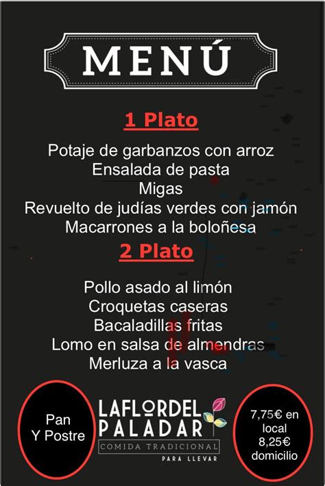 La Flor del Paladar ofrece menús a partir de 6,50€, incluyendo deliciosos platos y postres. Su pollo asado, servido con abundantes guarniciones, es uno de los platos más elogiados por su sabor y calidad. La presentación de los menús en material reciclable refleja su compromiso con el medio ambiente.