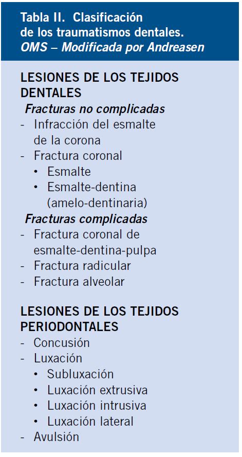 Existen distintos tipos de traumatismos dentales, y se clasifican según el tejido afectado: tejido dental, tejido periodontal o ambos.