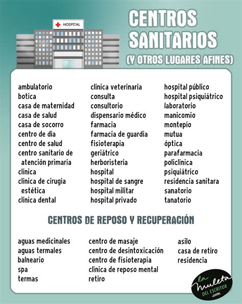 Además, se mencionan diversos tipos de centros sanitarios, clasificados según su naturaleza y servicios ofrecidos: