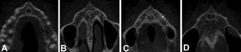 La imagen reformada de la panorámica reveló que la lesión quedaba comprendida en el interior de los alvéolos maxilares. El grueso de la lesión era una radiopacidad bien definida de forma irregular similar en aspecto al hueso.