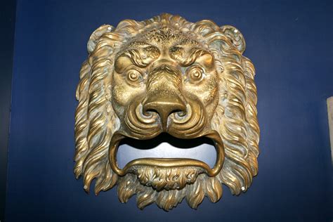 Pieza decorativa de cabeza de león en bronce.