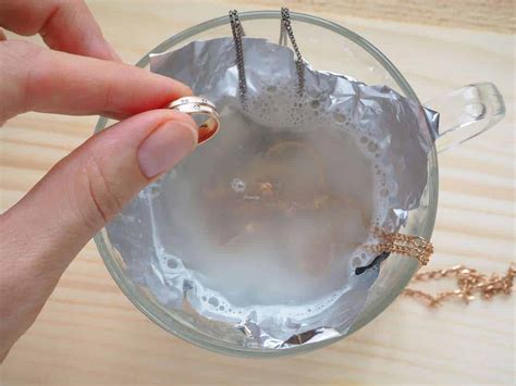Forra el fondo de un recipiente con papel de aluminio. Vierte una taza de agua caliente y mezcla con dos cucharadas de bicarbonato de sodio. Introduce las joyas y déjalas en remojo de dos a cinco minutos. Luego, retira las joyas y enjuágalas con agua fría.