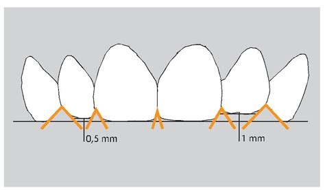 En caso de dientes excesivamente largos, puede ser conveniente alargar la zona de contacto, a fin de reducir en lo posible las distancias (tanto gingivales como incisales). De esta manera, los dientes aparecen en proporción más anchos y por ende también más cortos. Además, si no es posible crear una papila lo suficientemente larga, se puede alargar la zona de contacto hacia apical a fin de cerrar el espacio interdental cervical abierto.