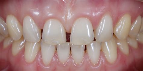 Fig. 13. Cuando las coronas pierden su longitud, los espacios interdentales incisales disminuyen de tamaño y los propios dientes parecen no sólo más pequeños, sino también más anchos.