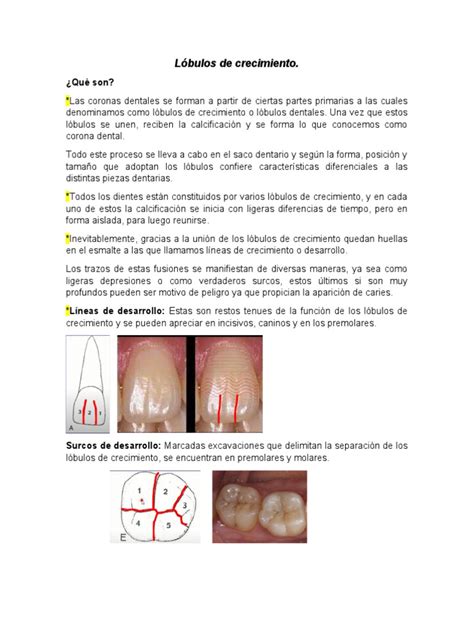 Los lóbulos de crecimiento son los puntos donde se inicia la calcificación de la corona en el esmalte, dentro del saco dentario. También se les llama lóbulos de desarrollo. En los dientes anteriores, tres forman la porción labial (mesial, central, distal) y el cuarto lóbulo lo forma el cíngulo o talón del diente. En los molares existen 2 lóbulos vestibulares y 2 linguales.