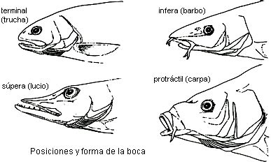 - Posición de la boca: La boca puede estar en el extremo anterior de la cabeza (terminal), puede estar dirigida hacia arriba (superior), o puede estar dirigida hacia abajo o bajo el pez (subterminal o inferior).