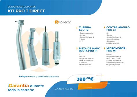- Turbinas: El instrumental que más se utiliza en las clínicas dentales, cada sillón debe de disponer de uno. La turbina es un instrumento rotatorio de alta velocidad que sirve para eliminar los tejidos duros del diente en los procesos de tratamiento de caries. En la cabeza se coloca la fresa. El cuerpo es la zona de prensión. Una turbina dental es un instrumental rotatorio que es impulsado por compresión de aire directamente a través de la manguera de la unidad dental mediante un acoplamiento. De entre todo el material rotatorio, es el que mayor velocidad tiene pero menor torque.