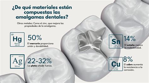 Las amalgamas están compuestas por una mezcla de metales, entre los que podemos destacar la plata, el estaño, el cobre o el mercurio y son utilizadas, principalmente por su durabilidad y resistencia. Estas amalgamas están compuestas por una mezcla de metales que incluye mercurio, plata, estaño y cobre. Estos metales se mezclan en proporciones específicas para lograr una amalgama de calidad. La amalgama dental es una mezcla de varios metales, principalmente mercurio, plata, estaño y cobre, que se utiliza para rellenar cavidades en los dientes.