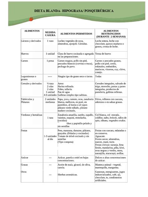 Ejemplo de dieta blanda postoperatoria.