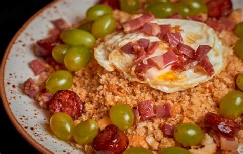 | Andaluzas | Pan duro, chorizo, panceta, ajos | Freír panceta y chorizo, dorar ajos, añadir migas humedecidas | Huevos fritos, uvas, pimientos fritos, melón |