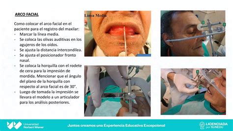 Para poder transferir la posición del modelo maxilar superior con respecto al resto de estructuras cráneo-faciales se hace necesaria la utilización del arco facial, en el caso mostrado se trata del arco facial Dentatus, de tipo Snow.