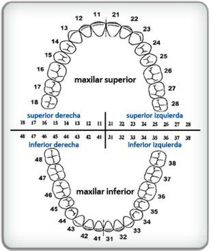 Dentro de cada cuadrante, los dientes se numeran del 1 al 8 empezando desde el centro (incisivos centrales = 1) hacia atrás hasta los molares (molar del juicio = 8).