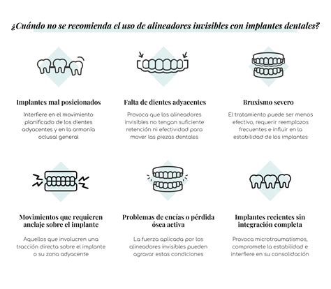 En ciertos casos, no se recomienda el uso de ortodoncia invisible con implantes. Por ejemplo, si los implantes están colocados en áreas donde se requiere un movimiento dental extenso, puede ser imposible alcanzar los resultados deseados con alineadores invisibles. La falta de espacio en la boca o condiciones como la pérdida de masa ósea también pueden influir en la decisión de no combinar ambos tratamientos.