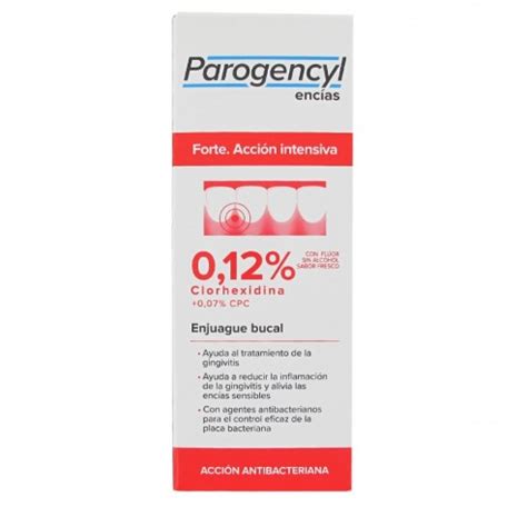 El colutorio Parogencyl Encías Forte de 500ml está diseñado para tratar y prevenir la gingivitis, una inflamación de las encías. Acción intensiva que ayuda al tratamiento y la prevención de la gingivitis. Las encías desempeñan un papel esencial en la protección de los tejidos que soportan los dientes. La acumulación de placa bacteriana puede provocar una inflamación ocasional de las encías: hinchazón, enrojecimiento y sangrado ocasional.