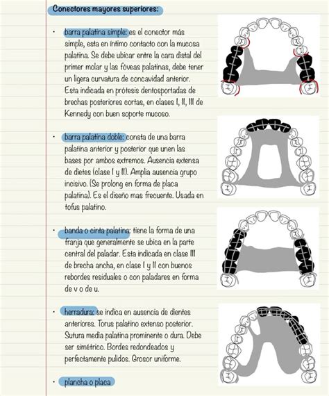 Los conectores mayores son esenciales para unir las diferentes partes de la prótesis y distribuir las fuerzas de manera uniforme. Existen diferentes tipos de conectores mayores para el maxilar superior e inferior.