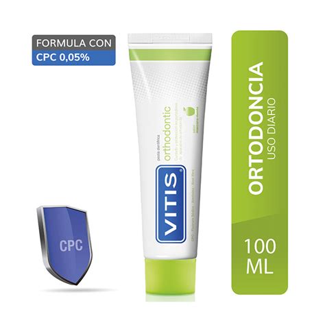 | Pasta Dental Vitis Orthodontic | Cloruro de cetilpiridinio (CPC), Fluoruro sódico | Previene la placa, remineraliza el esmalte, protege boca y encías |