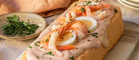 - Decora la parte de arriba con langostinos y alcaparras. Puedes ponerle en la base, lechuga mézclum, canónigos, escarola… y añadir algún langostino más.