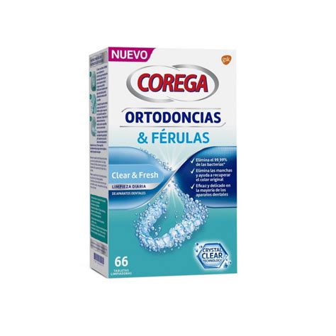 Corega Ortodoncias y Férulas son unas tabletas limpiadoras de uso diario que eliminan el 99,9% de las bacterias causantes del mal olor. Con la tecnología Crystal Clear, limpian eficazmente los aparatos dentales, ayudando a mantener tu aparato dental con el mejor aspecto, cuando se utiliza según las instrucciones. Este producto está especialmente diseñado para eliminar bacterias causantes del mal olor y conservar el buen estado de estos dispositivos.