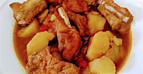Sirve caliente con un buen pan. Esta receta de patatas con costilla adobada es un plato que tomamos en casa como único.