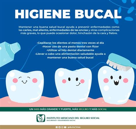 - Higiene Bucal Correcta: Cepillarse los dientes después de cada comida y visitar al dentista regularmente.