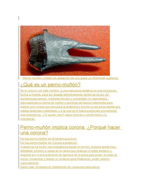Se le conoce con este nombre, a una estructura metálica en una sola pieza, hecha a medida, para ser alojada definitivamente dentro de la raíz del diente/muela (perno), mediante fricción y cementado (no atornillado), sobresaliendo en forma de muñón y sirviendo de fijación intermedia para retener una corona que devuelva la anatomía y función a una pieza dental que estaba destruida o debilitada, y a la cual se le había practicado previamente una endodoncia.