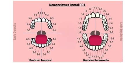 Aparte de los nombres científicos y populares, los dentistas utilizan una nomenclatura específica para nombrar a cada uno de los dientes de la boca. Se trata de la nomenclatura FDI (Federación Dental Internacional), que divide la boca en cuatro cuadrantes, dos en la arcada superior y dos en la inferior. El cuadrante 1 es el que se encuentra en la parte superior derecha, el 2 está en la parte superior izquierda. La numeración continúa en la parte inferior izquierda con el cuadrante 3 y el 4 está en la parte inferior derecha. En cada cuadrante dental hay ocho dientes, los cuales se enumeran de acuerdo a su posición. Se comienza por el incisivo central, que tiene el número 1 y termina en el tercer molar con el número 8.