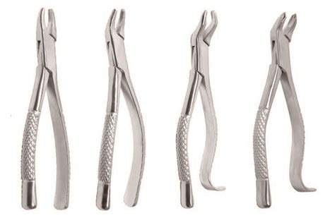 Se utilizan para extraer dientes, ya sean permanentes o deciduos (dientes de leche). La forma de la pinza de extracción depende del tipo de diente a retirar. Por ejemplo, las pinzas para molares son más anchas y robustas, mientras que las pinzas para incisivos son más delgadas y finas, permitiendo un mejor acceso a estos dientes más pequeños y anteriores.