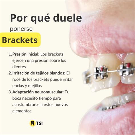 Durante la primera semana tras la colocación de los brackets se puede experimentar presión y dolor en los dientes y las encías, especialmente al masticar. Pueden aparecer llagas o dolor en el interior de las mejillas. Por lo general, este dolor se puede controlar con analgésicos. La mayoría de las personas se acostumbran a los brackets en aproximadamente un mes. Después de los primeros seis meses, es probable que ni siquiera se noten, aunque es normal experimentar algo de dolor de vez en cuando durante el tratamiento.