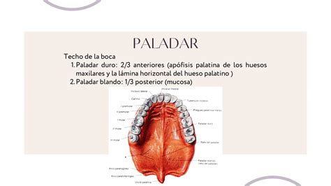 El paladar se encuentra en la parte superior interna de la cavidad bucal. Por esto también se le llama popularmente como cielo o techo de la boca. Este se encarga de separar la cavidad nasal de la bucal. Se divide en dos partes que son el paladar óseo, que es la zona más dura ya que está formado por huesos, y el paladar blando, que está recubierto con una capa de mucosa, que llega hasta la úvula en la parte posterior, a la que también se le conoce como campanilla. Es este el tejido el que impide que la comida pase hacia las fosas nasales y los pulmones.