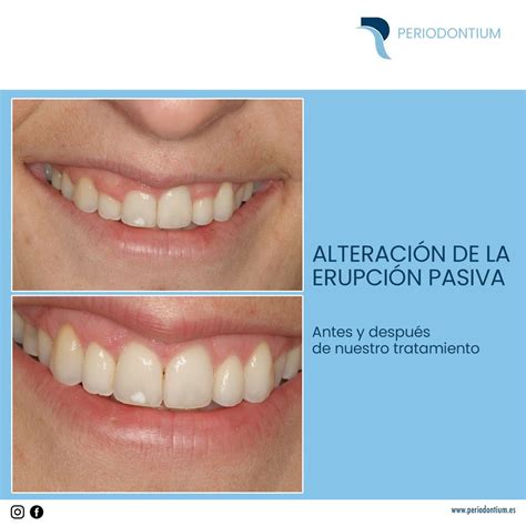 Esto tiene gran importancia tanto a la hora de realizar tratamientos restauradores en el sector anterior debido a la posible exposición de los márgenes de las restauraciones como consecuencia de la erupción pasiva como a la hora de diagnosticar y tratar esta entidad que si bien apenas presenta connotaciones patológicas, es responsable de gran número de consultas debido a las alteraciones que el exceso de encía puede producir en la estética de la sonrisa.