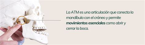 En palabras del Colegio de Odontólogos y estomatólogos de Alicante (COEA), la ATM es un sistema complejo de músculos, ligamentos, discos y huesos que actúa como una bisagra, responsable de mover la mandíbula inferior hacia delante, atrás y de lado a lado. La articulación temporomandibular se define médicamente como la articulación sinovial bilateral que conecta la mandíbula con el cráneo, específicamente entre el cóndilo mandibular y la fosa mandibular del hueso temporal.