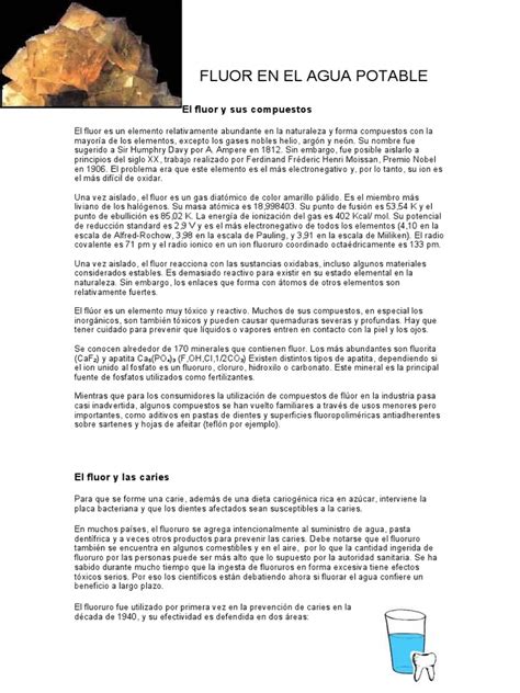 - Fluoruro: Hace referencia a los iones o a los compuestos que contienen flúor. Es la forma en la que generalmente se encuentra el flúor en el ambiente, por ejemplo, en el agua y en varios minerales. En contextos relacionados con la salud dental o el tratamiento del agua, “fluoruro” a menudo se refiere al ion de fluoruro (F⁻) o a compuestos como el fluoruro de sodio (NaF), que se utiliza en pastas dentales y en la fluoruración del agua.