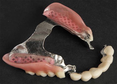 El otro tipo de prótesis removible recibe el nombre de esqueléticos dentales, confeccionados con una aleación metálica y las coronas dentales y la encía en resina.