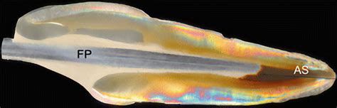 Imagen: Imagen polarizada de un canino superior tratado endodónticamente con un poste de fibra (FP) y cementado con un cemento autoadhesivo.