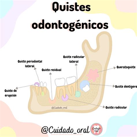 El 90% de los quistes de los maxilares son odontogénicos, es decir, que derivan del epitelio dental o de sus restos. En la mandíbula pueden desplazar progresivamente el paquete vasculonervioso dental inferior, con casos aislados de anestesia o parestesia.