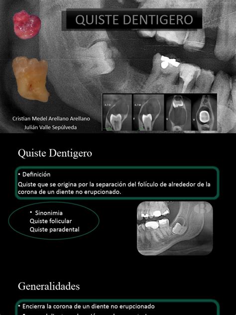 Quiste se define como una bolsa conectivo-epitelial, tapizada en su interior por epitelio y recubierta en su cara externa por tejido conectivo, que encierra un contenido líquido o semilíquido. Son asintomáticos y se descubren en estudios radiográficos de rutina.