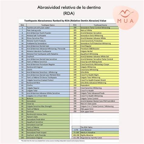 Tanto la ADA como la Sociedad Española de Epidemiología y Salud Pública Oral establecen rangos de abrasividad recomendados para las pastas dentales. Según la ADA, las pastas dentales con un RDA de 0 a 70 se consideran de baja abrasividad, de 70 a 100 son moderadamente abrasivas y de 100 a 150 tienen una abrasividad alta.