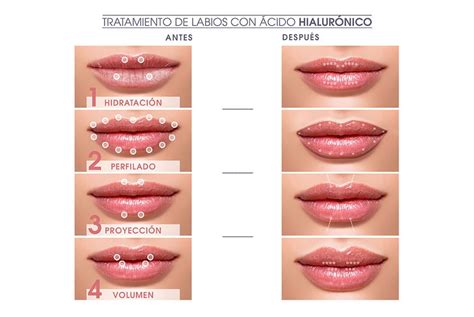- Relleno de labios: Uno de los usos más populares del ácido hialurónico es para aumentar el volumen y definir el contorno de los labios.