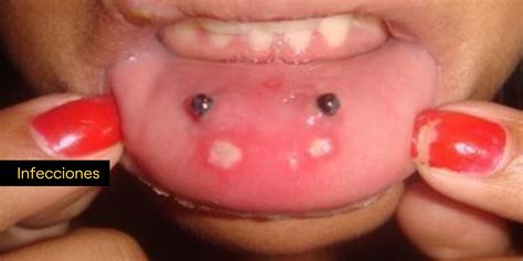 - Infecciones: La boca es un ambiente húmedo que contiene millones de bacterias. Es un lugar ideal para la generación de infecciones. Esto se amplifica con las perforaciones, principalmente en la lengua, y particularmente en los días inmediatamente posteriores al procedimiento. En un alto número de casos se dan por el déficit de condiciones higiénicas mínimas del lugar donde se realiza el piercing (instrumental no esterilizado, o mismo material para dos personas con una escasa limpieza).