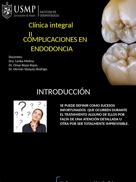 | Infección | Sellado incompleto, filtración apical | Inflamación, absceso, fístula | Reendodoncia, antibióticos, cirugía periapical |