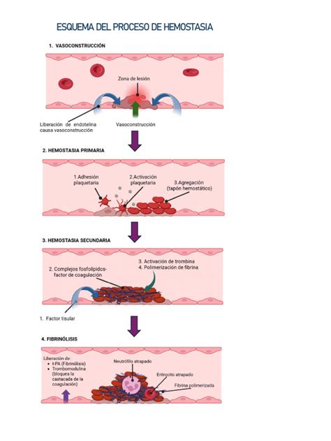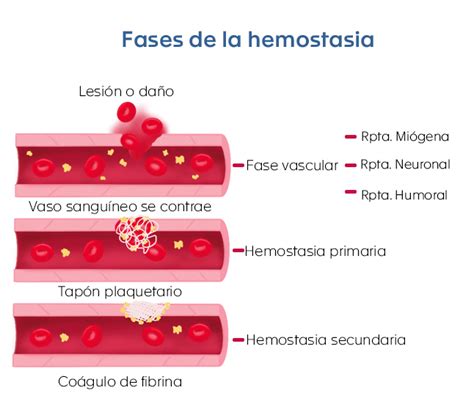 El mecanismo de la hemostasis incluye una serie de cambios bioquímicos y fisiológicos que los situaríamos en 4 apartados interdependientes:- Vasoconstricción local: Se produce una contracción de las fibras musculares lisas de los vasos, provocando una vasoconstricción arteriolar y metaarteriolar refleja local por el traumatismo de su pared inmediatamente después de que se lesiona o se rompe; a su vez, se reduce el flujo de sangre que accede a la zona de la hemorragia.