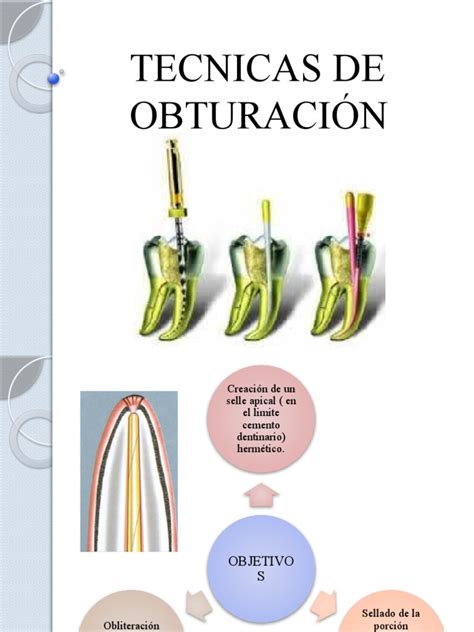 Existe una gran variedad de técnicas de obturación que se indican de acuerdo a la anatomía interna del sistema de conductos radiculares y su preparación mecánica. Actualmente, con la evolución de los cementos selladores, especialmente los cementos hidráulicos y biocerámicos, los procesos de obturación se han facilitado mediante el uso de técnicas de cono único.