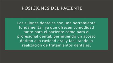 La posición del sillón dental es crucial para diferentes procedimientos y situaciones en la clínica dental. A continuación, se describen las posiciones más comunes: