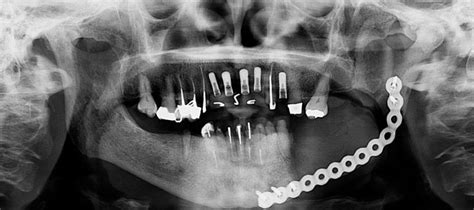Se presenta el caso de una paciente de 84 años con osteoporosis, que presentó osteonecrosis mandibular tras la colocación de 6 implantes 5 meses después de la administración de denosumab. Una ortopantomografía y una TC mostraron pérdida ósea de la cresta mandibular y exposición ósea periimplantar.