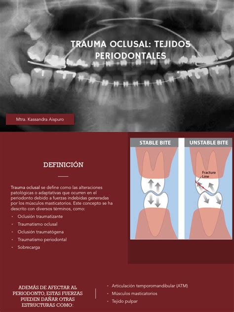 El trauma oclusal es el daño que produce cambios en los tejidos del aparato de inserción como resultado de las fuerzas oclusales, puede estar causado por inestabilidad oclusal (discrepancias oclusales, migraciones dentales), hábitos parafuncionales como bruxismo o ambas. Es el fracaso de la estructura de soporte para resistir o adaptarse a estas fuerzas.