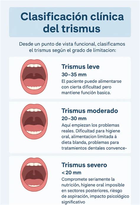 - Trismus severos: Incapacidad casi total para abrir la boca, afectando gravemente la alimentación e higiene.