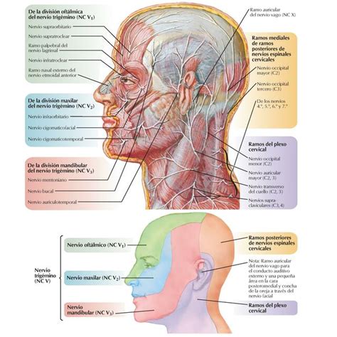 Nervios principales de la cabeza, incluyendo el nervio maxilar.