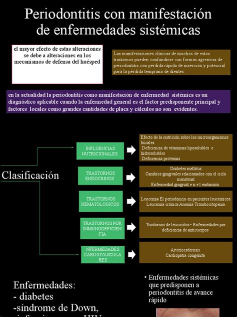 - Enfermedad cardiovascular: la periodontitis es un factor de riesgo para el desarrollo de enfermedad cardiovascular arterioesclerótica.