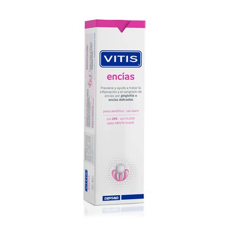 Vitis® Encías es una pasta dentífrica de uso diario indicada para las personas susceptibles de padecer problemas en las encías (inflamación, enrojecimiento o sangrado) y encías delicadas. Además, se recomienda en personas con encías delicadas o con predisposición a padecer gingivitis, ya que previene y ayuda a tratar los problemas de encías manteniéndolas en buen estado.